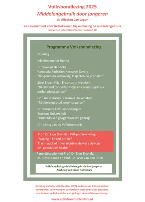 Na de succesvolle Volksbondlezing 2023 organiseerde de Stichting Volksbond Rotterdam op 13 november een tweede lezing, die in het teken stond van middelengebruik en verslaving onder jongeren, met speciale aandacht voor de risico’s en de effecten van vapen.